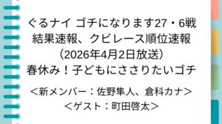 ゴチになります27今日の結果速報(2026年) ぐるナイ ゴチになります27・第7戦の結果速報、クビレース順位速報(2026年4月16日放送)ゲストは町田啓太で「春休み!子どもにささりたいゴチ」